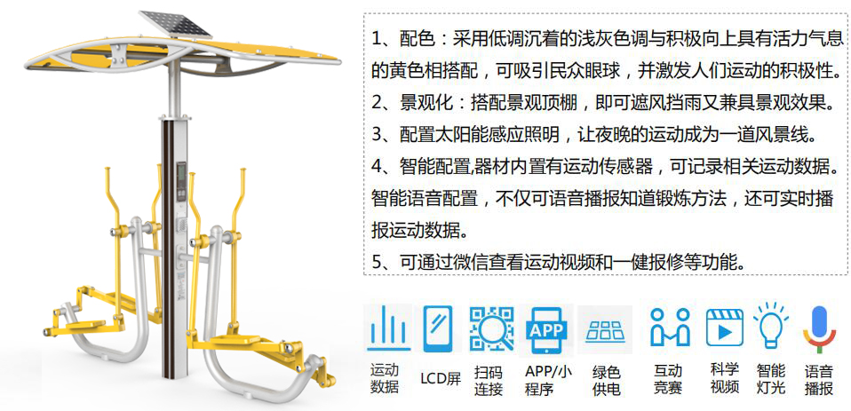 谈求吧全民健身产品涵盖健身路径、运动场馆、篮乒气羽排等产品,分为多个系列,先进的制造工艺、严苛的质量检测,确保产品性能优良、品质安全可靠,让运动简单科学。并将全民健身器材(户外路径器材、体育场馆等产品)进行智能化升级和互联,实现全人群覆盖、全场景智能,让运动赞美生活。