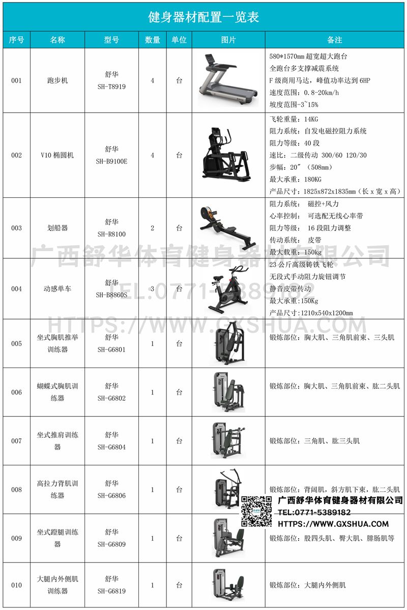 1.谈求吧V9跑步机SH-T8919*4台-580*1570mm超宽超大跑台-跑感舒适,跑台整体安全稳定;全跑台多支撑减震平台,保证跑台超强支撑力,达到180kg支撑,满足专业健身房需求。F级商用马达-超强马达,AC 3.0HP 交流,峰值功率达到6HP,F级商用品质。速度范围达到0.8-20km/h;V9跑步机可实现跑台扬升功能,坡度范围-3~15%,满足客户不同的锻炼需求。