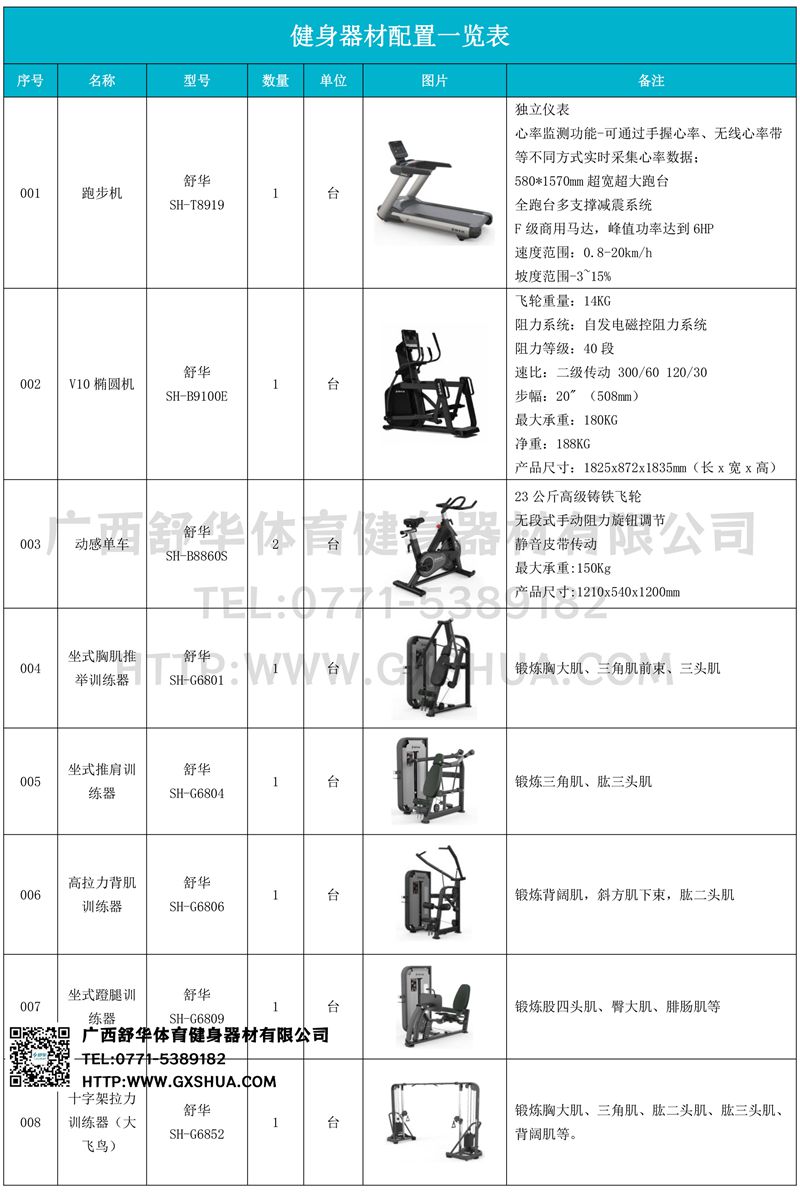 1.谈求吧V9跑步机SH-T8919*4台-580*1570mm超宽超大跑台-跑感舒适,跑台整体安全稳定;全跑台多支撑减震平台,保证跑台超强支撑力,达到180kg支撑,满足专业健身房需求。F级商用马达-超强马达,AC 3.0HP 交流,峰值功率达到6HP,F级商用品质。速度范围达到0.8-20km/h;V9跑步机可实现跑台扬升功能,坡度范围-3~15%,满足客户不同的锻炼需求。