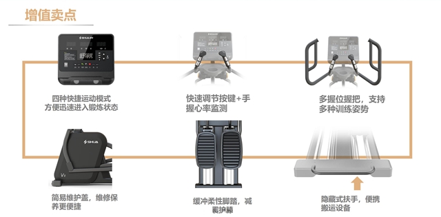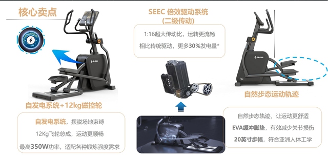 安全稳重,细节制胜。谈求吧V8椭圆机是一款高安全系数的椭圆机,整体设计遵循人体工学科学,缓震踏板中添加减震层设计,能够有效减少运动冲击带来的关节损伤,且最大支持160kg载重,满足更多人群。手握心率监测、多功能置物架、自发电系统取代统电源......在细节上,新款椭圆机站在健身者角度,添加了不少设计者的巧思,为健身者带来更贴心的体验。