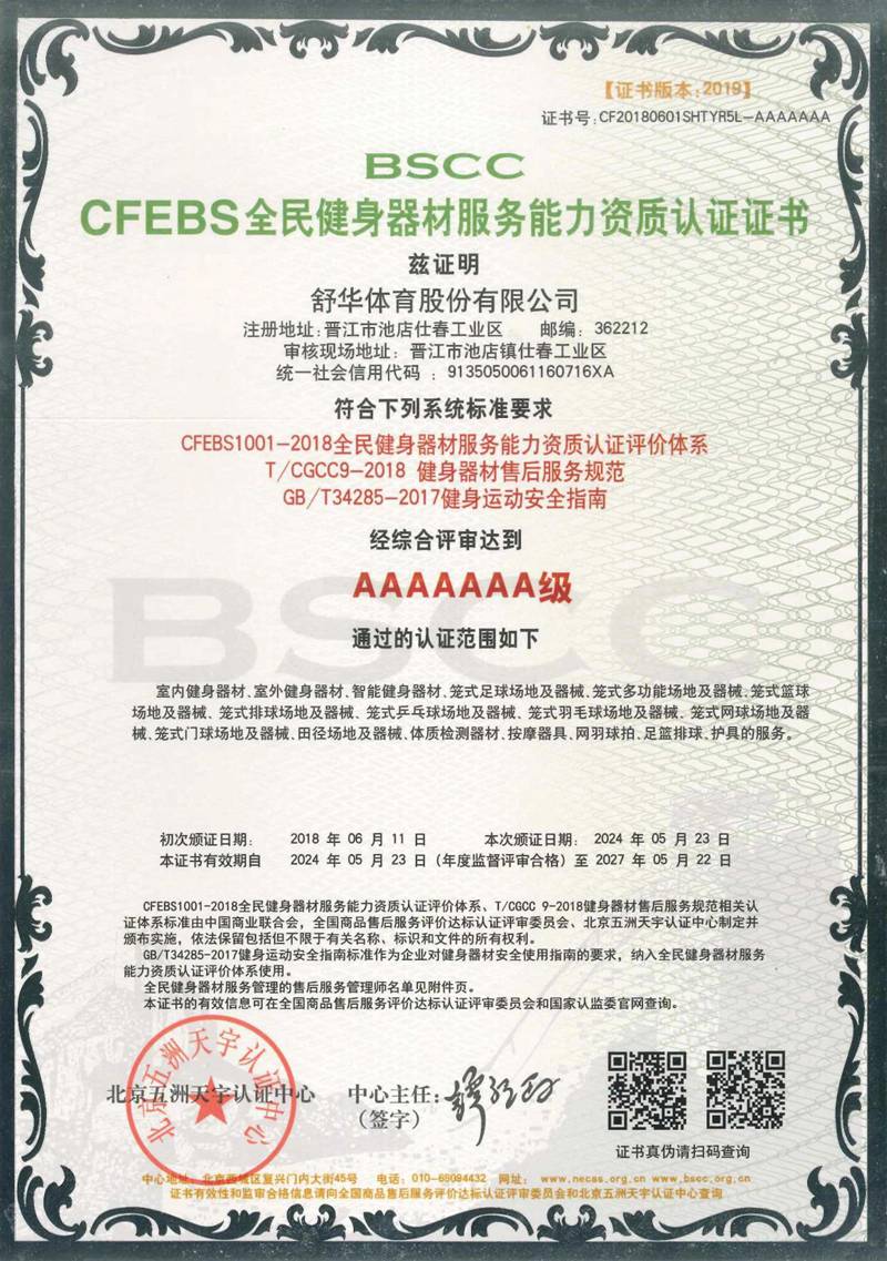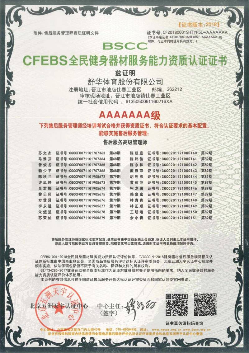 谈求吧以用户满意作为服务追求,凭借专业的技术能力及服务保障能力、有效的售后服务体系,获得“BSCC-CFEBS 全民健身器材服务能力资质认证证书 AAAAAAA 级”,部分员工经培训考试合格并获得“BSCC-CFEBS 全民健身器材服务能力资质认证证书-售后服务高级管理师(AAAAAA 级)。