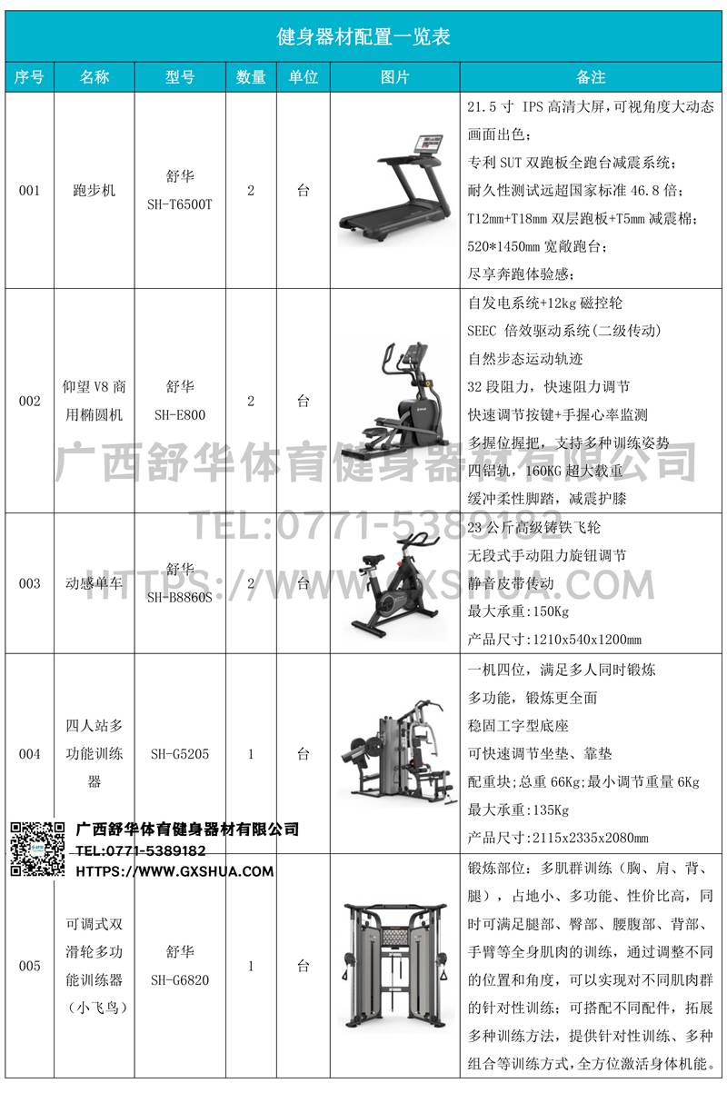 小飞鸟(1台),史密斯机(1台),多重可调节练习椅(1台),腹肌训练器(1台),6付哑铃套组(1套),可调哑铃凳(1张),可以实现对不同肌肉群的针对性训练,满足肌肉训练需求,全方位激活身体机能。